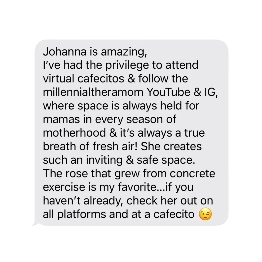 Through live journaling cafecitos, wellness pláticas, and on-demand resources, this space helps new moms go from feeling isolated, overwhelmed, and disconnected from themselves to feeling grounded, supported, and more at home in their motherhood and identity.